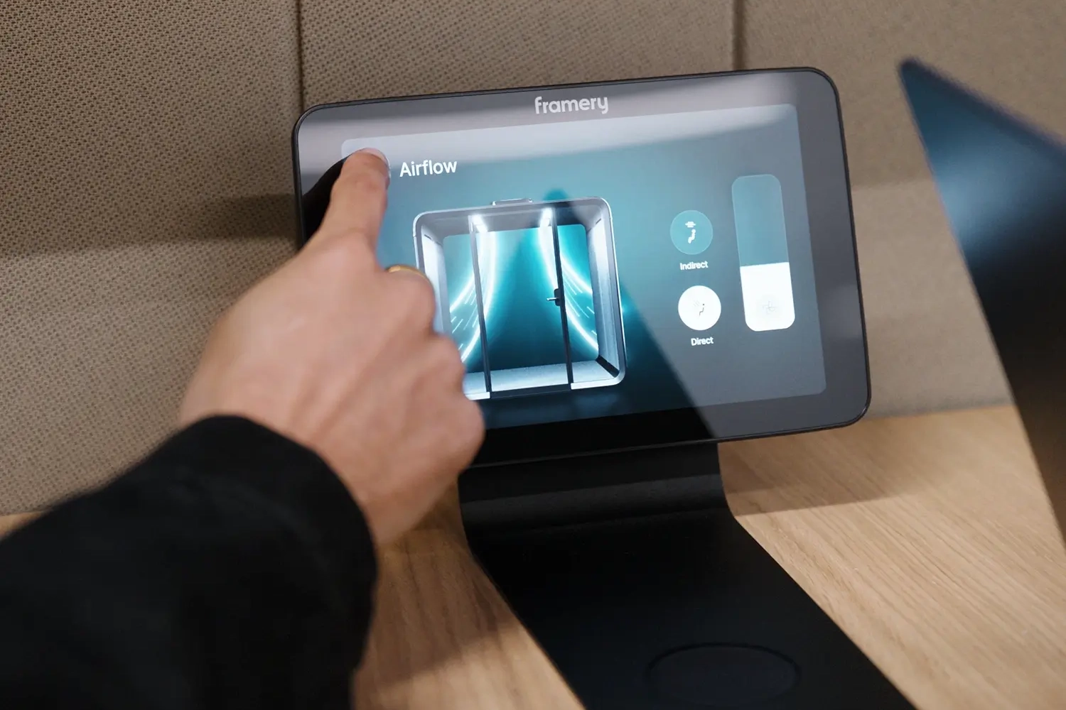 A FRAMERY akusztikus fülkék minden részlete a felhasználók igényeire szabott. A 8 hüvelykes, nagy felbontású érintőképernyővel könnyen szabályozhatja nem csak a funkcionális, de a kényelmi beállításokat is; az adaptív szellőztetést, légáramlást, valamint a naptárban elvégzett foglalások kezelését, meghosszabbítását.